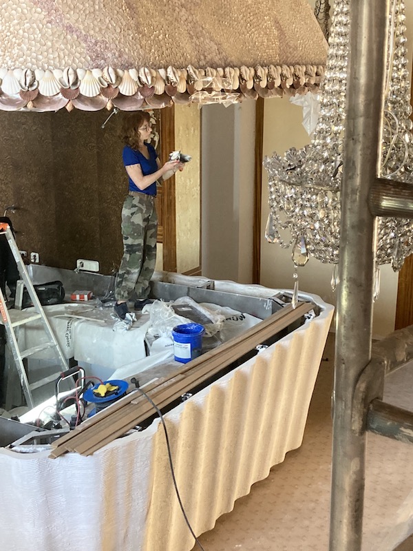 Coupe de Bois en miroir au dessous du futur bar |